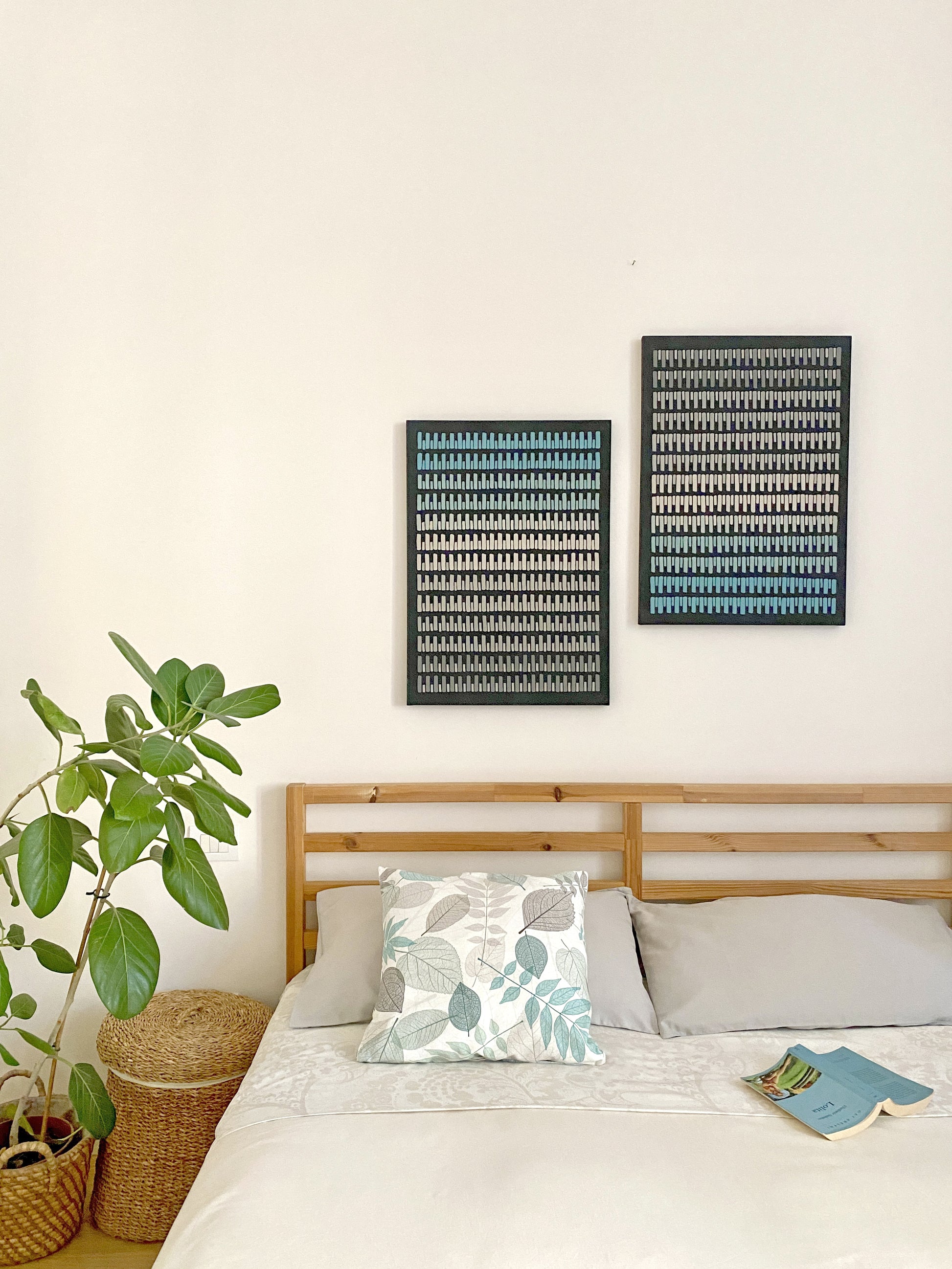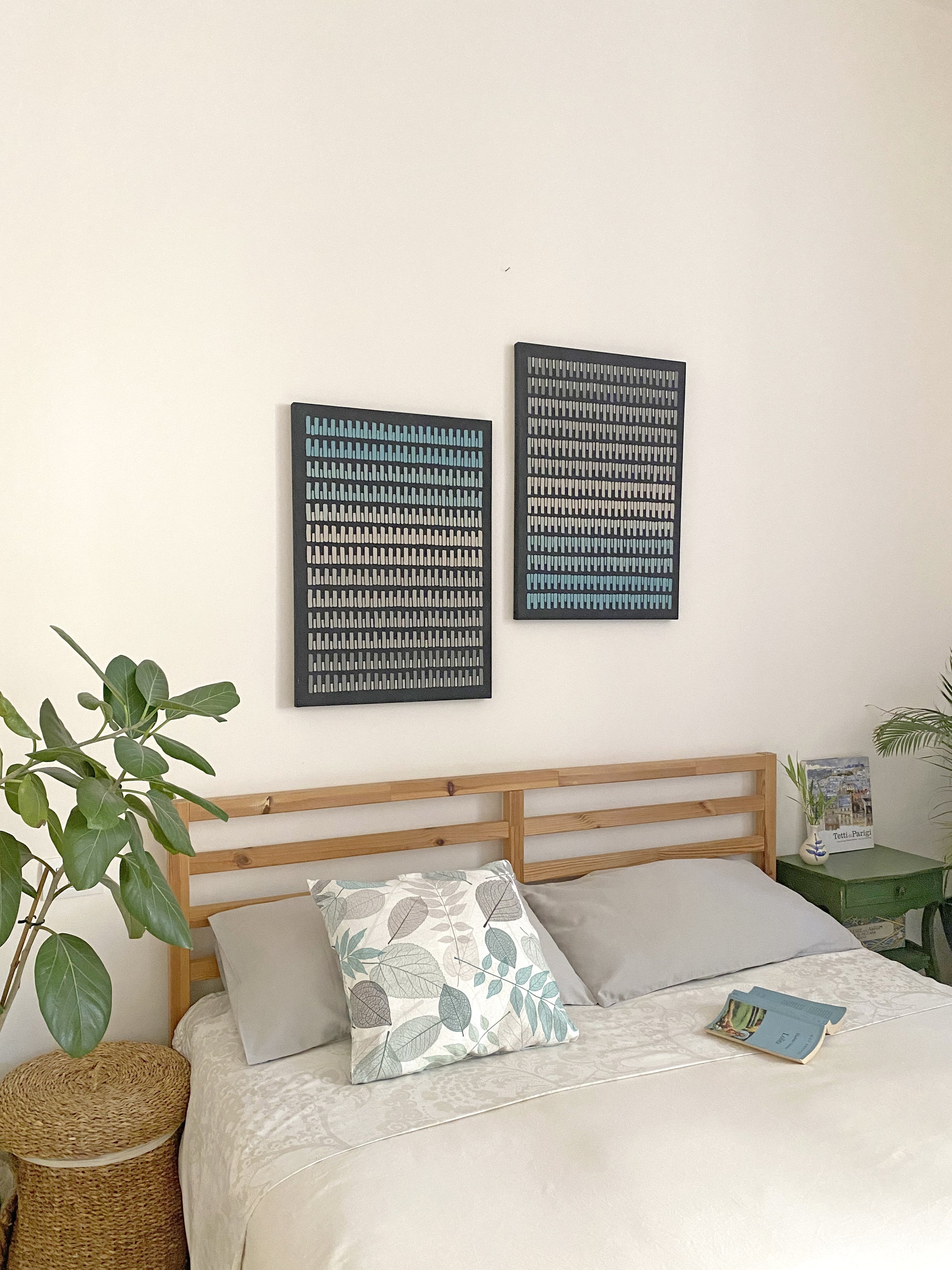 Dittico composto da due tele, ciascuna di dimensioni 50x70x3. Totale dell'opera compresi spaziature (consigliati 8 cm, circa) 108x70x3.